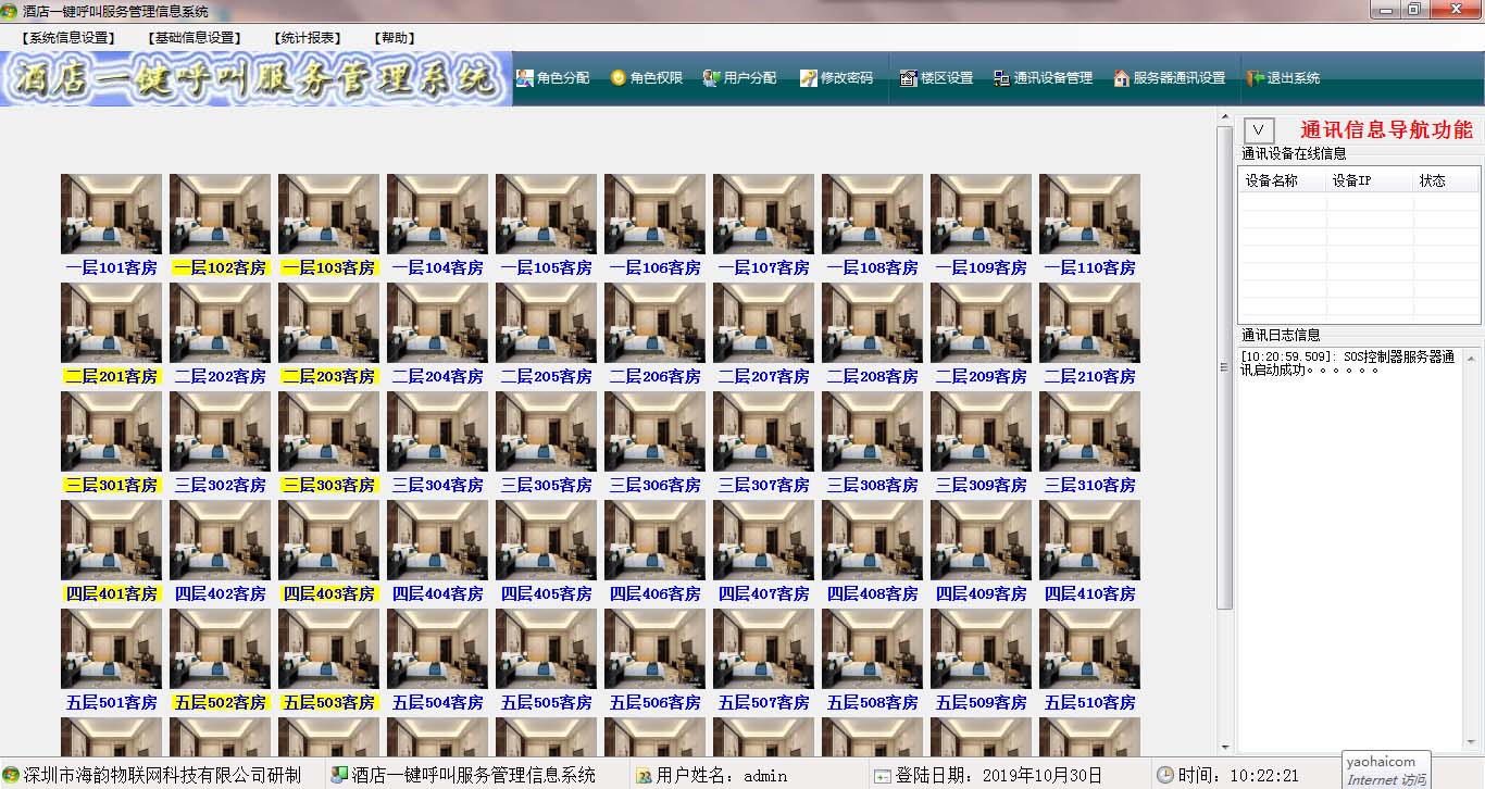 深圳市海韻物聯網科技有限公司的SOS智能監控管理系統,是對(大型酒店、中型酒店、小型酒店)進行研發的一款智能監控產品,酒店一鍵呼叫服務軟件系統是分布式架構,網絡版軟件體系,實現酒店多個前臺同時安裝酒店一鍵呼叫軟件系統,監控酒店客房協同辦公模式。整個酒店一鍵呼叫服務系統需要在酒店大樓內實施監控設備綜合網絡布線。酒店大樓室內客房監控需要在樓區樓層安裝SOS控制器設備,酒店大樓客房房間內需要布線安裝開關設備,一個SOS控制器設備可以控制25個開關設備,SOS控制器設備跟酒店一鍵呼叫服務系統平臺建立網絡連接進行一鍵呼叫服務信息傳送,酒店一鍵呼叫服務系統平臺會顯示酒店客房一鍵呼叫服務運行地圖,同時會提示呼叫聲音。酒店一鍵呼叫服務系統平臺跟酒店數據庫服務器建立連接,酒店數據庫服務器負責存儲酒店客房一鍵呼叫服務信息及前臺監控室值班人員處理呼叫信息。酒店一鍵呼叫服務系統平臺主要是為酒店客房住戶提供一鍵呼叫服務需求,酒店客戶是上帝、酒店是以高質量服務為目標,同時提高酒店高檔次的全方位為酒店客戶提供滿意的服務,滿足不同客戶的各種需求。疫情期間,一鍵呼叫服務可以代替人與人之間的接觸,起到隔離作用。酒店客戶通過一鍵觸發信號傳送到前臺監控室,實現酒店值班人員24小時為客戶提供高質量安保服務。酒店一鍵呼叫服務軟件系統具有安防體系,取代了攝像頭只能安裝到樓層的功能,如遇突發事件一鍵報警服務功能,實時監控到酒店每層客房住戶。解決客房住戶提出的所有服務。如:下水管道堵塞服務、客房漏水服務、退房服務、酒水服務、遇突發事件(火災、搶劫)等報警服務等,提高酒店的高服務質量,通過(對講機、電話)等快速及時的解決酒店客房住戶提出的所有服務活動,讓酒店住戶體驗到酒店真誠無微不至的照顧和關愛,為酒店節省人力、物力、財力等資源。讓酒店適應迅猛發展的市場經濟及多變的信息化市場,提高酒店在配套市場中的競爭能力,提高企業整體的管理經營機制,實現企業整體信息鏈高度集成的智能監控管理信息體系平臺。